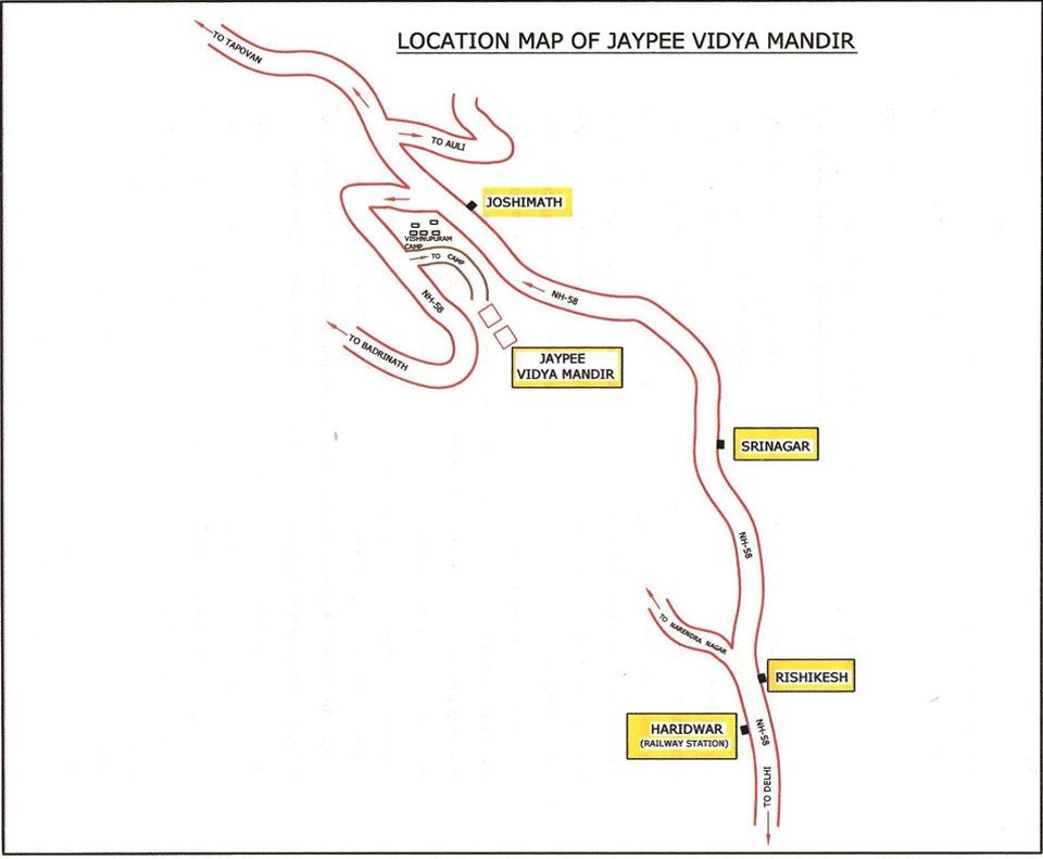Jaypee Vidya Mandir is located at Vishnupuram 5 Kms North of Joshimath, along NH-58 towards the Holy Shrine of Badrinath. The school has picturesque surroundings, pollution free environment and forested rugged mountains with the musical Alaknanda River flowing below it in the renowned Dev Bhoomi of Uttarakhand.